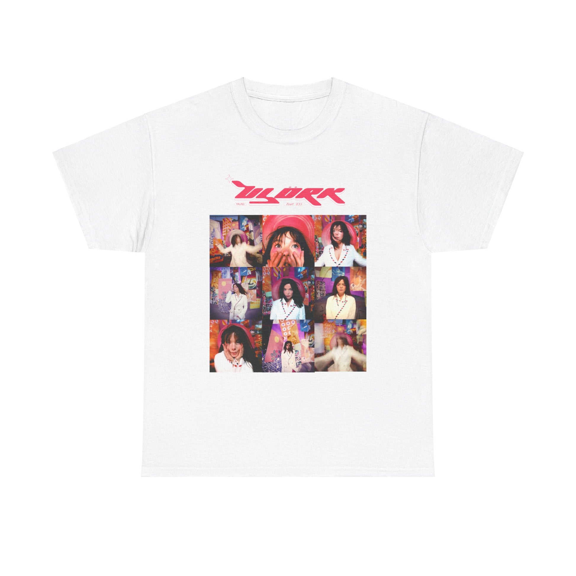 This vintage style tee honors Icelandic icon Björk's magnum opus album "Post" with outtakes from the album cover shoot and a Y2K era logo.